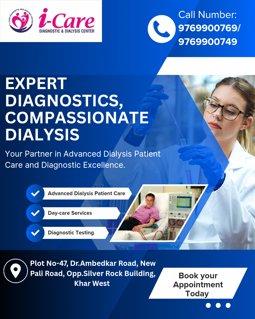 I Care Diagnostic And Dialysis Center Plot No.47, New Pali Road Silver Rock Apartment, Dr Ambedkar Rd, Khar West, Mumbai, Maharashtra +918048037212 icarecenter4u@gmail.com