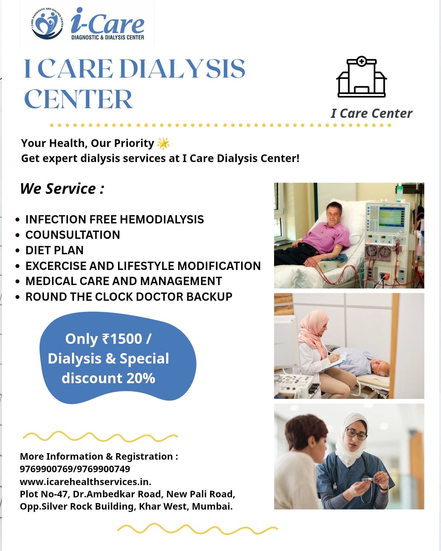 I Care Diagnostic And Dialysis Center Plot No.47, New Pali Road Silver Rock Apartment, Dr Ambedkar Rd, Khar West, Mumbai, Maharashtra +918048037212 icarecenter4u@gmail.com
