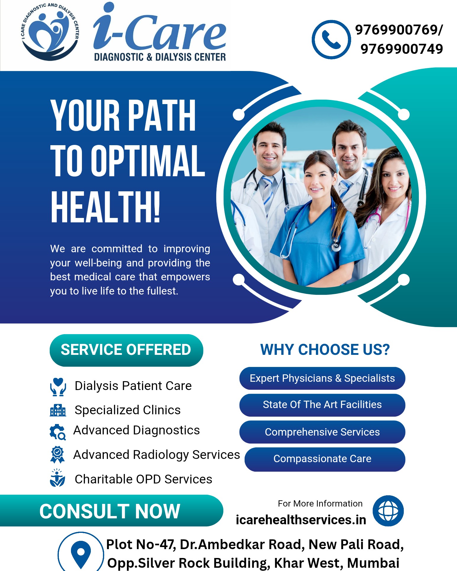 I Care Diagnostic And Dialysis Center Plot No.47, New Pali Road Silver Rock Apartment, Dr Ambedkar Rd, Khar West, Mumbai, Maharashtra +918048037212 icarecenter4u@gmail.com