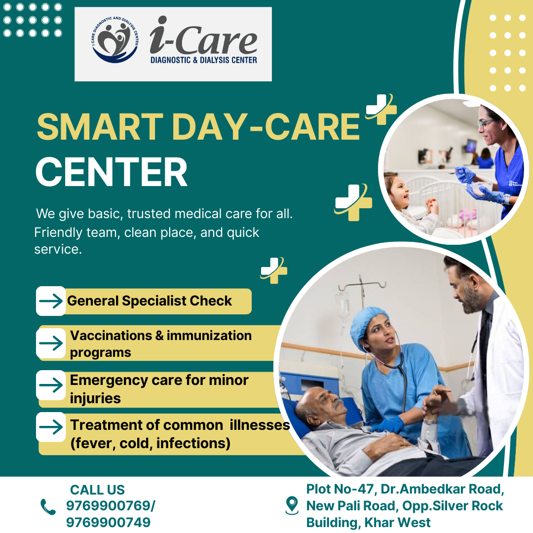 I Care Diagnostic And Dialysis Center Plot No.47, New Pali Road Silver Rock Apartment, Dr Ambedkar Rd, Khar West, Mumbai, Maharashtra +918048037212 icarecenter4u@gmail.com