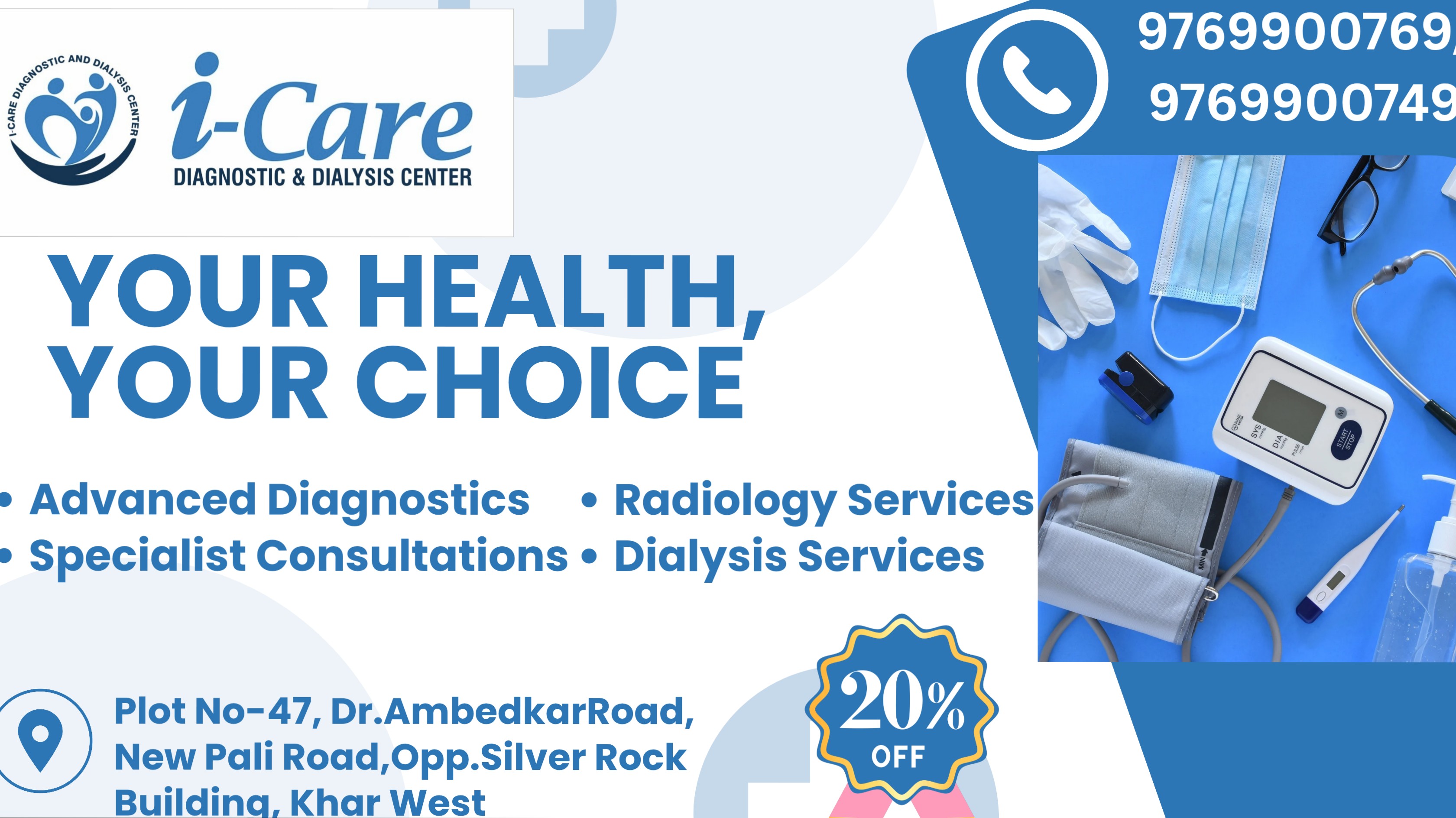 I Care Diagnostic And Dialysis Center Plot No.47, New Pali Road Silver Rock Apartment, Dr Ambedkar Rd, Khar West, Mumbai, Maharashtra +918048037212 icarecenter4u@gmail.com